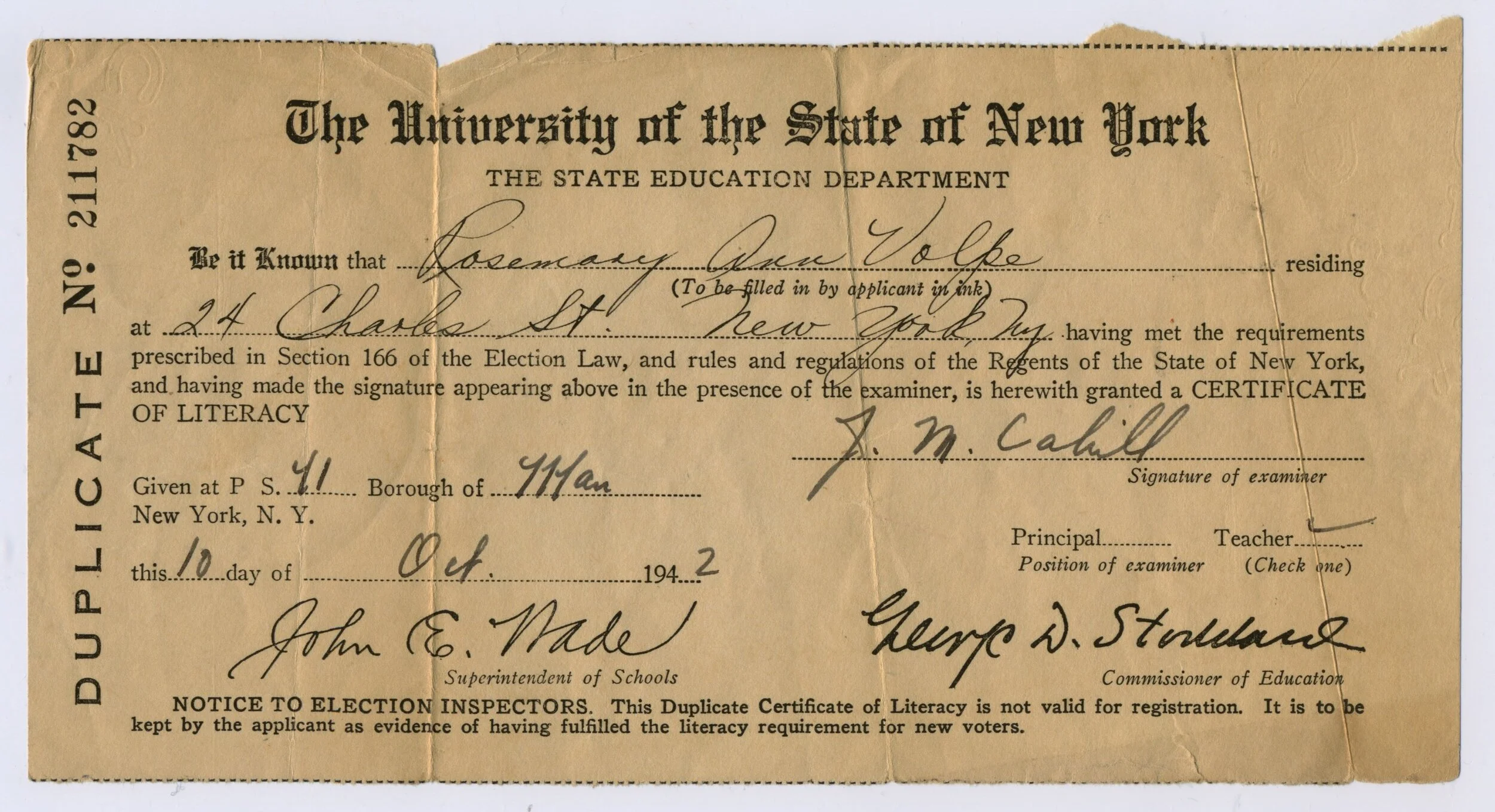 BP: I have a certificate and it says that in 1946 my mother was an inspector for the voting polls! In 1946! And my grandmother was a suffragette in 1920! I have a whole bunch of stuff here – documents about all of this and pictures. We’re going to put a lot in the book. A lot of pictures and different things. It’s not only going to be about the family but the neighborhood, the Village, the West Village, and what it did for people and how it operated! It was an Irish Italian neighborhood mainly but we had Jewish people and we had Chinese people we had black people and it just didn’t matter!